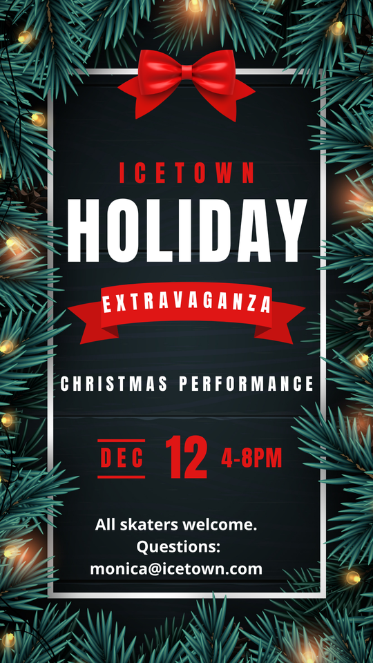 This is an in-house competition for skaters to perform holiday-themed routines and events that will be judged on categories such as "Best performance", "Most Artistic", "Most Creative", "Most Festive" etc. All Skaters are welcome to participate and all skaters will receive an award. Spectator admission is free. Couples please pay one entry fee of $85 and then enter partner's name on registration notes.